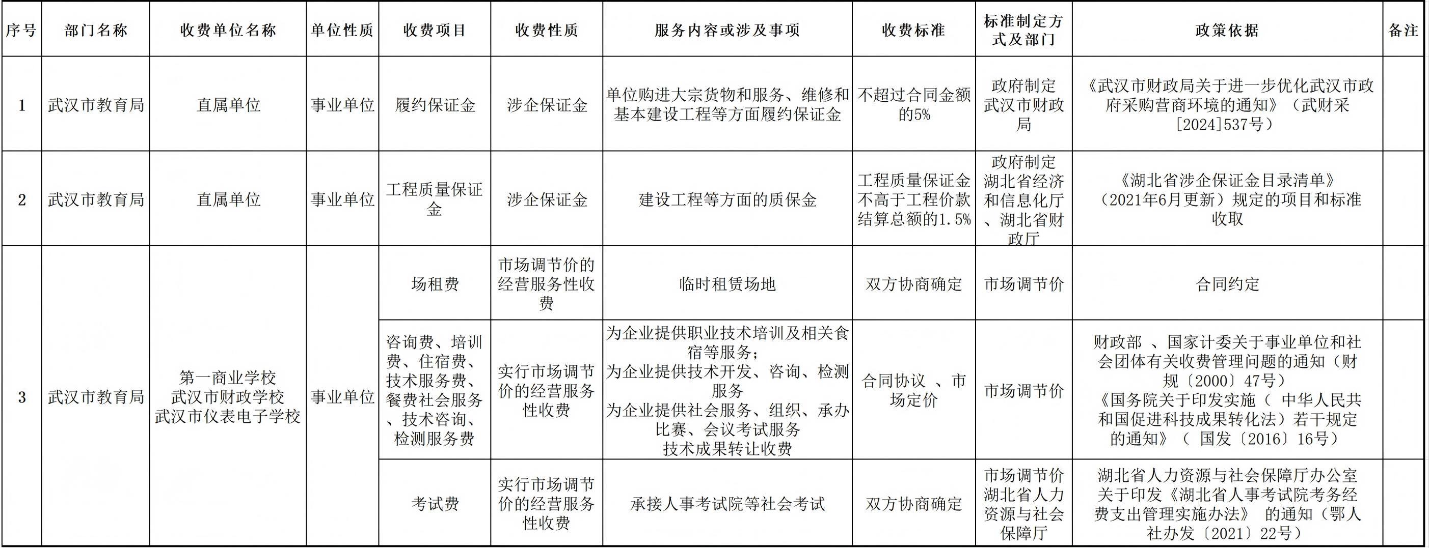 武汉市教育局综合性涉企收费目录清单